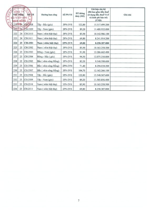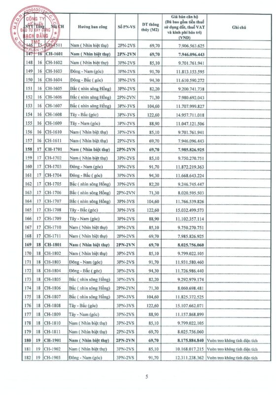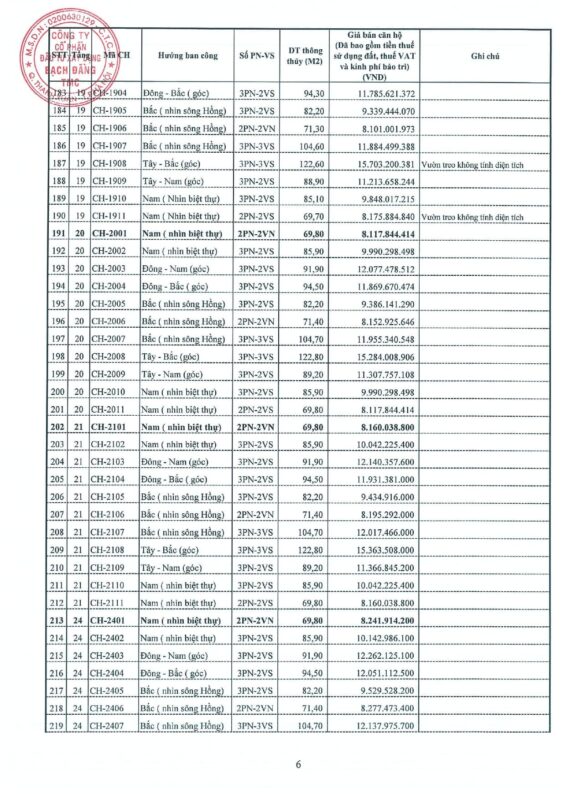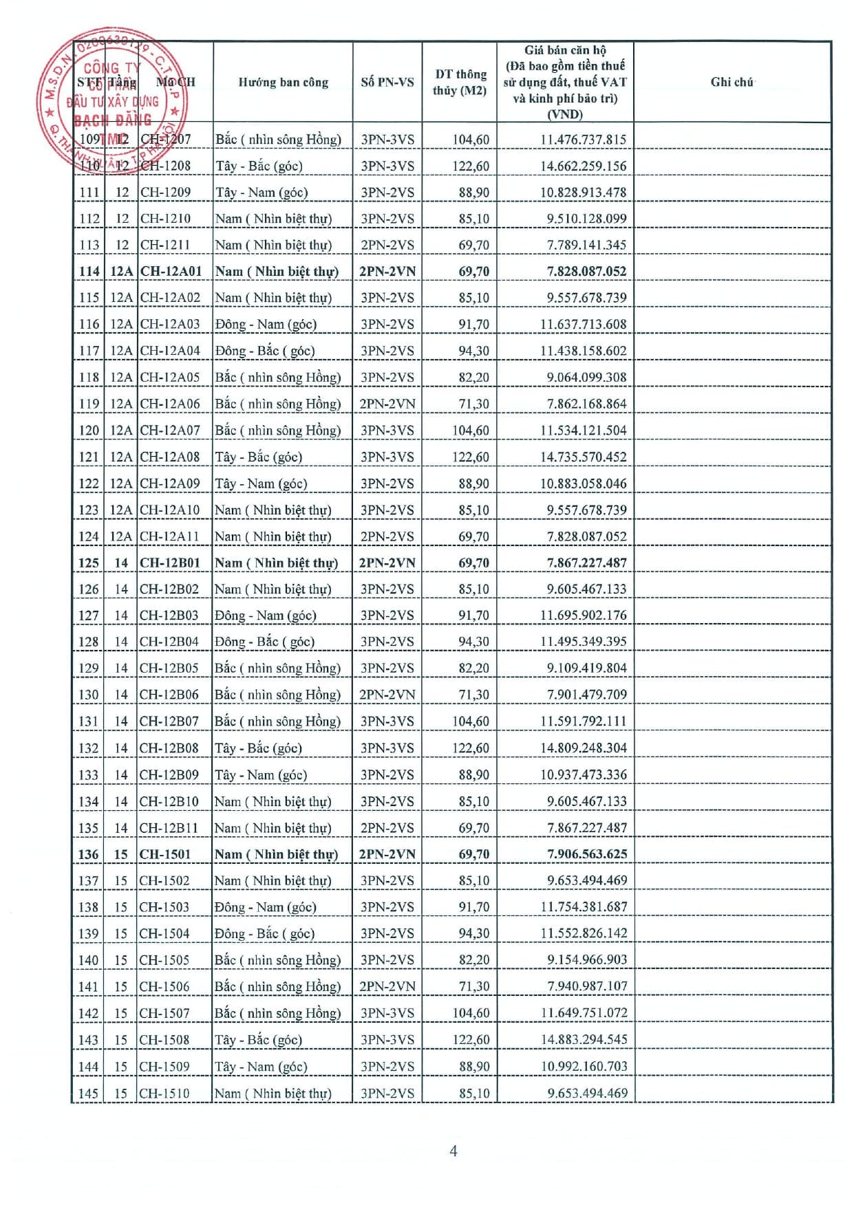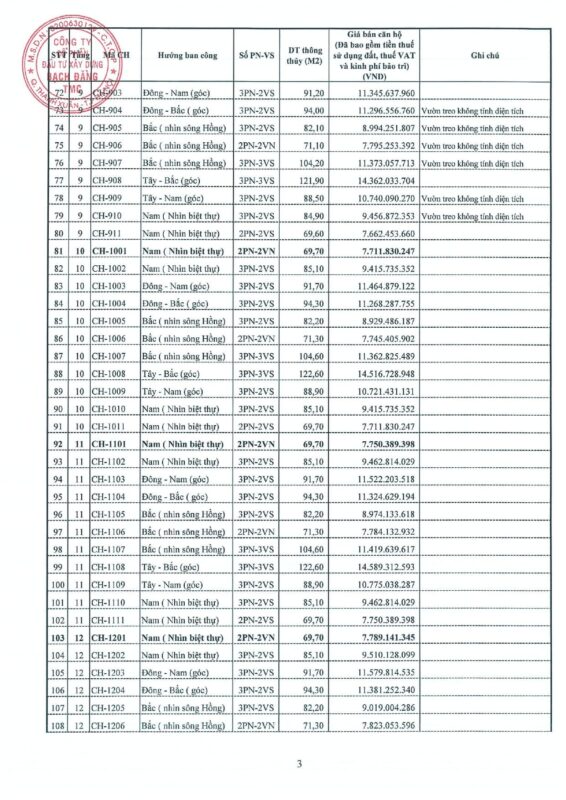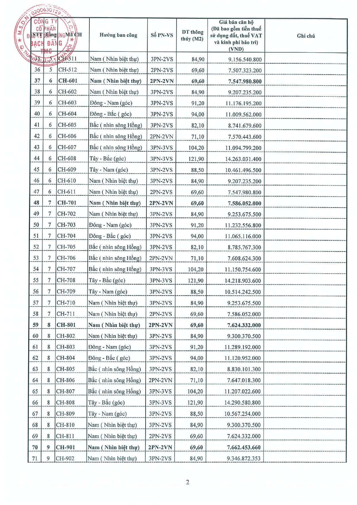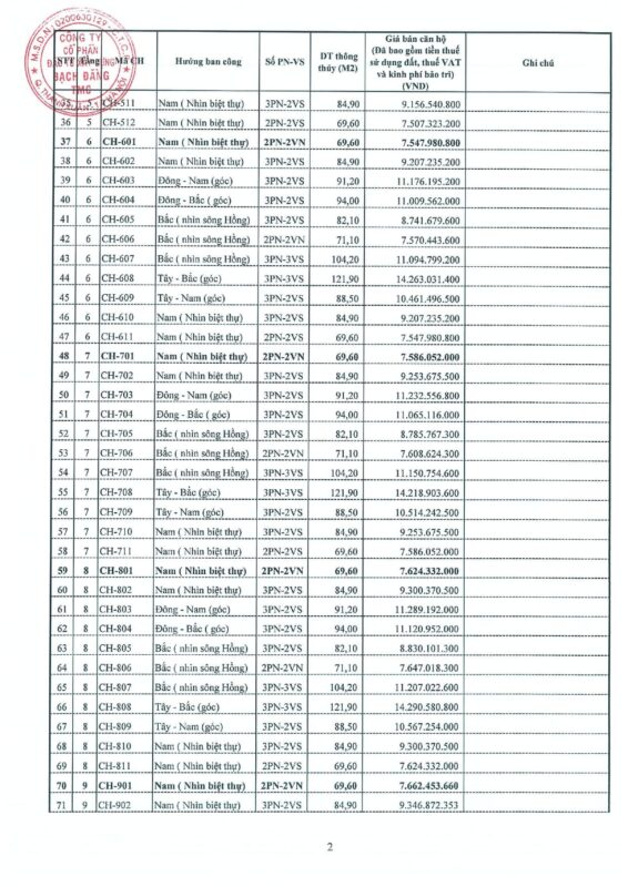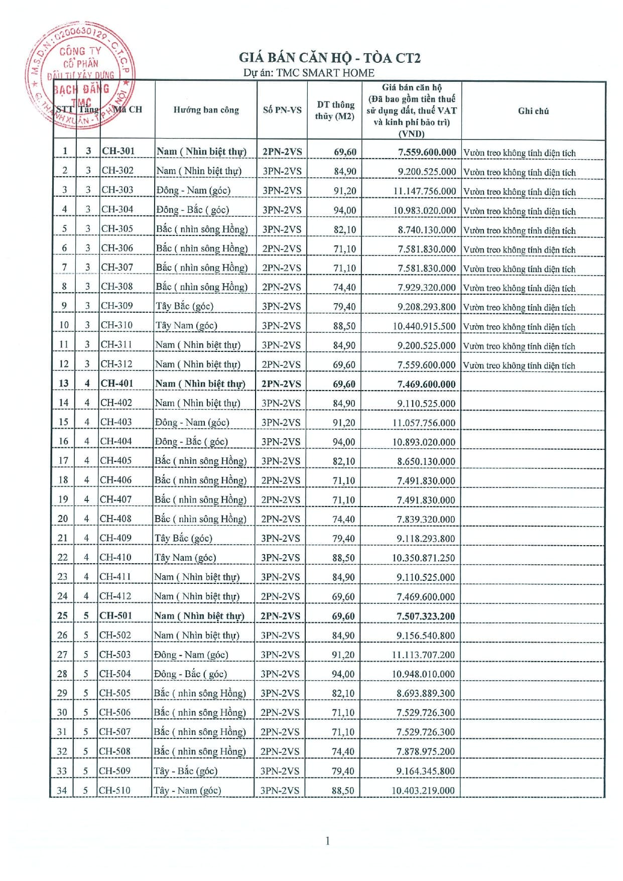 Phía dưới là  Bảng Giá bán chung cư TMC Smart Home tòa CT2. Nếu dùng điện thoại, anh chị bấm vào ảnh để phóng to.