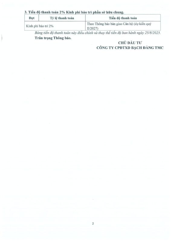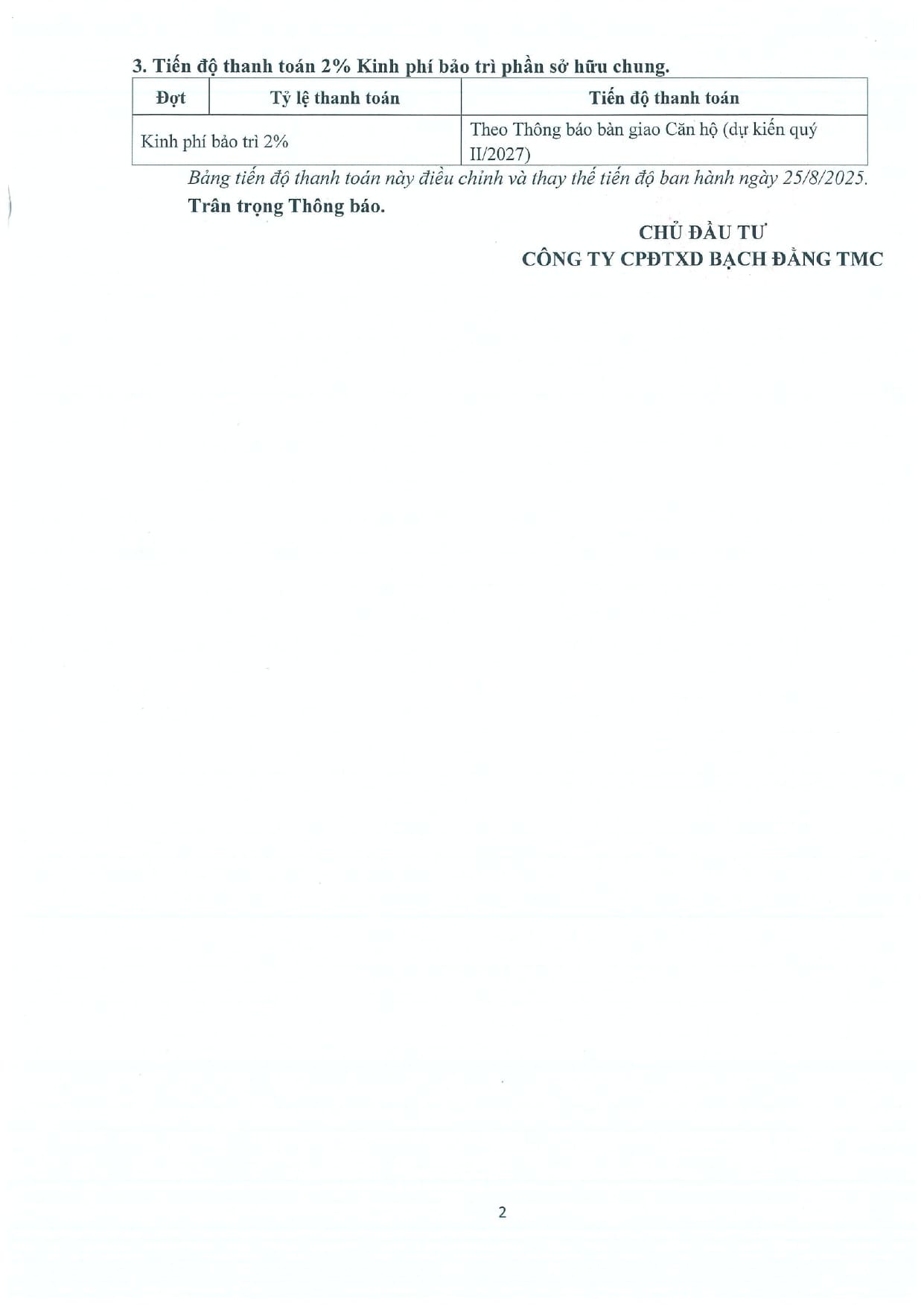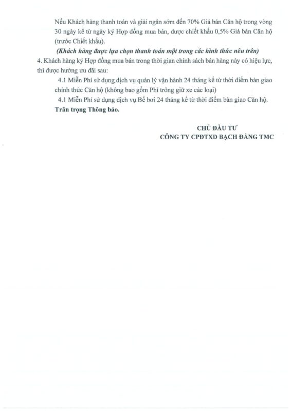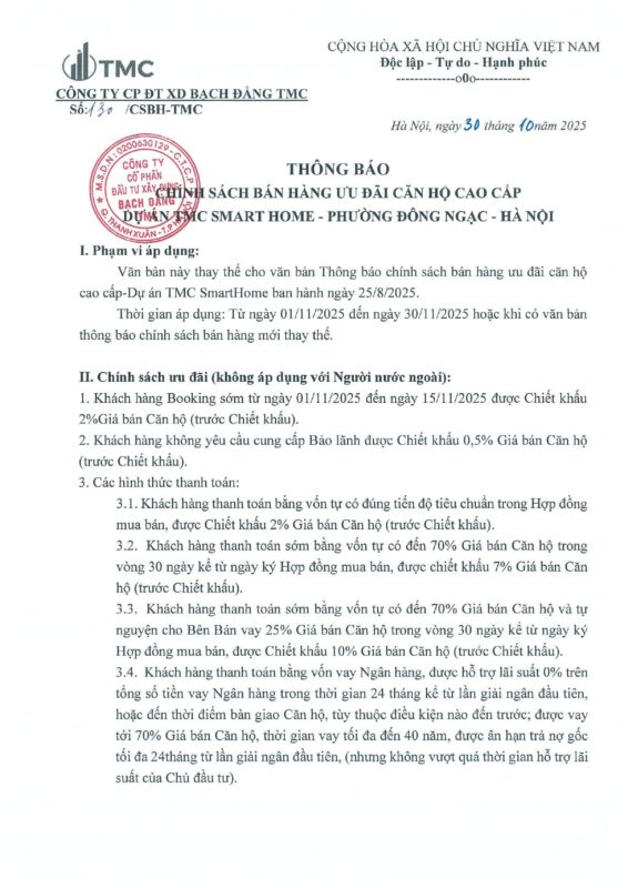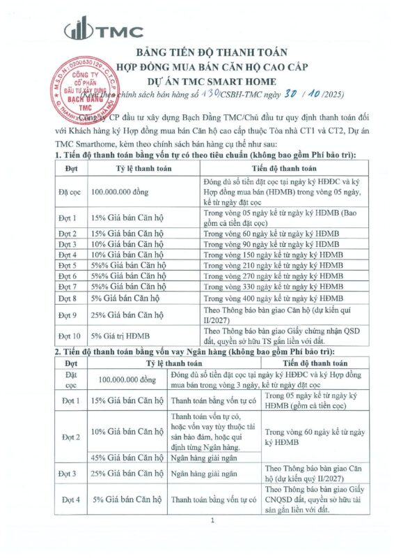 Phía dưới là văn bản dấu đỏ Chính sách bán hàng và Tiến độ thanh toán TMC Smart Home của chủ đầu tư. Mời anh chị xem chi tiết. Nếu anh chị dùng điện thoại, anh chị có thể nhấn vào ảnh để phóng to.